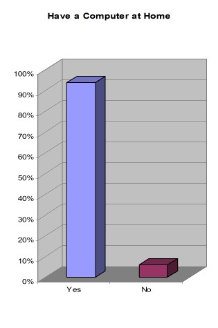 An equal number of those not having a computer at home also did not have an email account, though it was not necessarily the same individual. Ninety-four percent do have an email account so it could be concluded that some of these accounts are made while using a computer that is not at home. Of the students surveyed, 100% said that they could go onto the Internet at school. As Tricia recounts, "Sure, I go onto the Internet all the time at school. During class, in the computer lab, the teacher thinks we are doing our spreadsheets but we are really on the Net…. Its so cool!". With so many having Internet access it was interesting to see what their primary use for it was. Only 12% found that researching information was the most favorite use for the Net, while 76% used it for entertainment purposes, chatting, games, and surfing. Twelve percent stated that their favorite use was accessing their email. Yet, even with these seemingly benign uses of the technology, "When browsing the web your fingerprints are left every place that you stop (Alwang, Mendelson, Rubenking, 2001, pg. 153)
